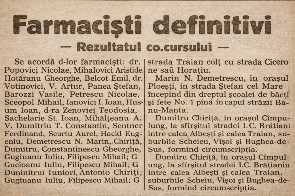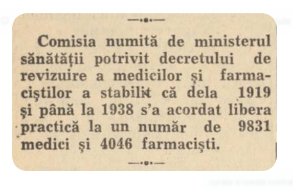 Toate diplomele de medici și farmaciști vor fi supuse revizuirii dacă nu au fost obținute la o universitate din România. Comisia pentru Examinarea Licențelor Profesionale ale Medicilor și Farmaciștilor care și-au obținut diplomele în străinătate este compusă după cum urmează: Dr. Oktavian Burileanu, Dr. Basil Teodorescu, Dr. C. Sturza, Consilier Privat, Farmacist Emil Belcot. Membri supleanți: Dr. Simici, Dr. Săvescu, Rosetti Bălănescu, Farmacist Hotaranu. Banater Deutsche Zeitung, Februar 1938 (Jahrgang 20)