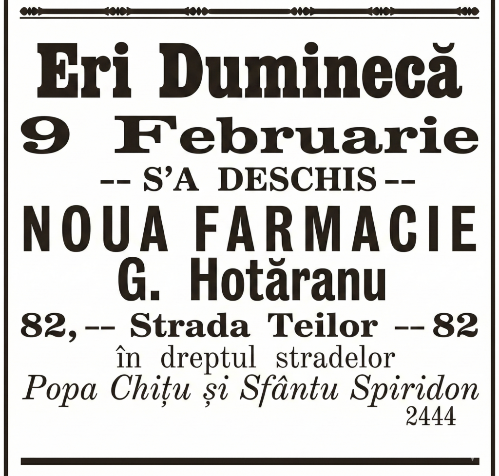 Drumul început de „spicearii” lui Brâncoveanu și de farmaciștii sași din epoca fanariotă culminează în perioada interbelică. Farmacia nu mai este doar un loc unde se pisează prafuri, ci o instituție care îmbină știința cu estetica urbană. În acest context de efervescență și eleganță a „Micului Paris”, farmacistul Dumitru Hotăranu apelează în 1925 la arhitectul Statie Ciortan pentru a ridica imobilul de pe strada Maria Rosetti.
