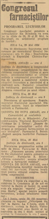 PROGRAMUL LUCRĂRILOR Congresul Asociației generale a farmaciștilordin România va avea loc in zilele de 29, 30 și 31 Mai, la București, cu următorul program de lucrări: ZIUA I-a, 29 Mai 1924 Ora 10 dimineața. Depunerea unei coroane pe mormântul Eroului Necunoscut , ora 11 dim. Deschiderea oficială a Expoziției Chimico-Farmaceutice. DUPĂ AMIAZI — ora 4 Sedința de deschidere a congresului Cuvântarea președintelui la deschiderea congresului. Citirea și aprobarea procesului-verbal al ultimei ședințe a congresului precedent. Darea de seamă a casierului asupra situației financiare a Asociației și a gestiunei sale. Raportul censorilor de verificare a gestiunei financiare. Alegerea cenzorilor pe anul viitor. ZIUA II-a, 30 Mai Ședința de dimineață — ora 9 Discutarea și aprobarea Regulamentului Statutului Asociației. Discuțiuni asupra legei de organizare unitară a Farmaciei. ȘEDINȚA DE DUPĂ AMIAZI, ora 4 Comunicări și conferințe Farmacist dr. A. Mihalovici: „Cercetări asupra Tincturei Bestucheffi“. Profesor dr. I. Orient: „Despre determinarea principiilor activi din drogue și preparate farmaceutice pe cale biologică“. Farmacist E. Belcot „Raport asupra lucrărilor Farmacopeei”, ZIUA III-a, 31 Mai Ședința de dimineață, ora 9 Discutarea propunerilor scrise primite de birou. Farmacist G. Hotăranu: „Expunere asupra proectului de Regulamentul pentru comerțul cu narcotice“. Farmacist E. Belcot: „Câteva constatări asupra situației actuale a farmaciei române”. ȘEDINȚA DE DUPĂ AMIAZI, oral Complectarea locurilor vacante din comitul Asociației. Fixarea localităței pentru viitorul congres, închiderea congresului. Pentru 1 Iunie s’a organizat o excursiune la Constanța și de aci cu vaporul la Balcic și înapoi. In acest scop s’a angajat vaporul „Principesa Maria“, special pentru această excursiune, având următorul itinerar : La 1 Iunie, orele 24 (12 noaptea), plecarea cu vaporul „Principesa Maria“ la Balcic. La 2 iunie, orele 6 dimineața, sosirea la Balcic. Vizitarea pitorescului oraș Balcic și întoarcerea la ora 1 după amiazi și sosirea în Constanța la ora 7 seara. Dimineaţa, mai 1924