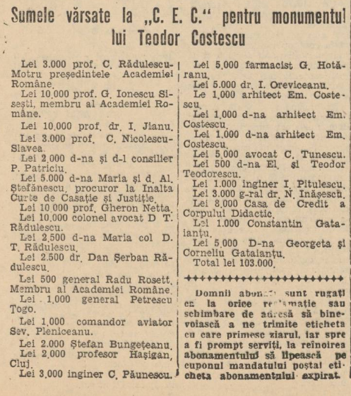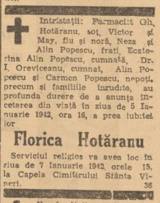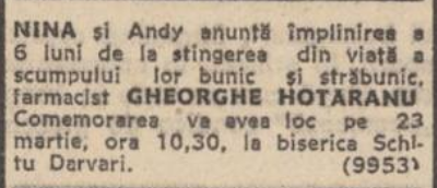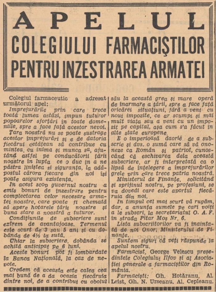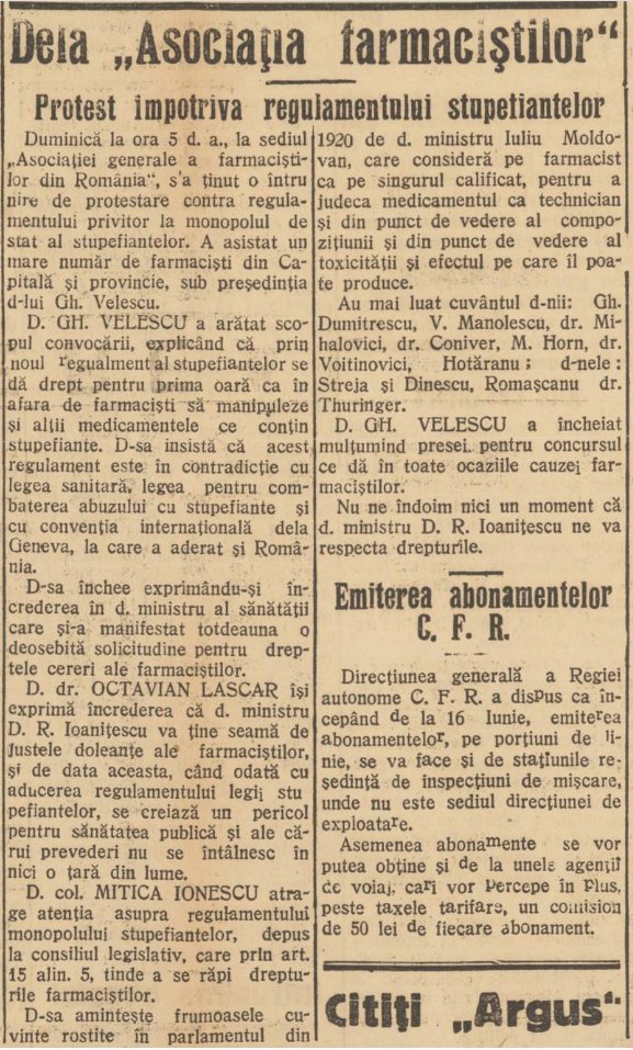 Ca răspuns la scrisoarea d-lui farmacist Ovidiu Nicolescu, publicată în „Dimineaţa“ No. 8.649, din 22 Ianuarie 1931 (în mod ciudat scrisoarea nu apare în ediția menționată și nici în ediția de după sau cu o zi înainte), vă rog să binevoiţi a publica alăturatul Proces – Verbal al Asociaţiei Generate a Farmaciştilor din România, din care se poate constata adevărul. Cu distinsă stimă, (ss) Farmacist GH. HOTARANU*
